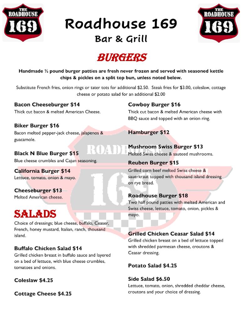 Roadhouse 169 offers a diverse menu, showcasing burgers, salads, and unique appetizers. The 1/2 lb burgers stand out with options like Bacon Cheeseburger and Mushroom Swiss Burger. The salad selection includes classic favorites, such as Grilled Chicken Caesar. Appetizers range from Breaded Cauliflower to Cheese Curds; these dishes pair perfectly with drinks. A Saturday Steak Night offers options like Queen and King Steak for meat lovers. For kids, a menu includes Grilled Cheese and Chicken Strips, ensuring there is something for everyone. Overall, the menu reflects a commitment to hearty, satisfying meals for all.